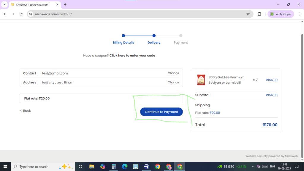 डिलीवरी पेज पे डिटेल्स चेक करने के बाद Continue to payment पे क्लिक करे.
